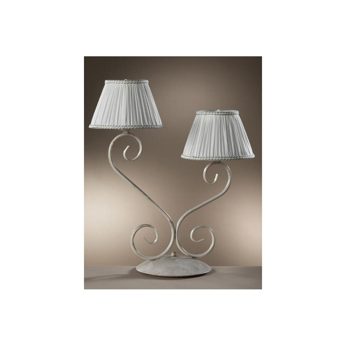 La lampada da tavolo Vivienne si presenta con una struttura dalle linee semplici, con steli arricciati, realizzata in metallo con finitura avorio reso anticato da alcune spennellature color oro realizzate a mano in Italia.