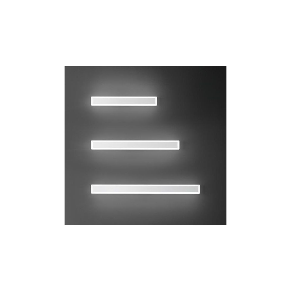 Lampada da parete con un design moderno, che può essere installata sia in orizzontale che in verticale, che viene prodotta in alluminio verniciato a polvere nel colore Bianco oppure Nero (a vostra scelta) con il diffusore in acrilico satinato che percorre il perimetro esterno dell'intera struttura rettangolare. Viene prodotta in tre diverse misure, da scegliere in fase d'ordine: con una lunghezza di cm 62.5, con una lunghezza di cm 82.5 oppure con una lunghezza di cm 100.
