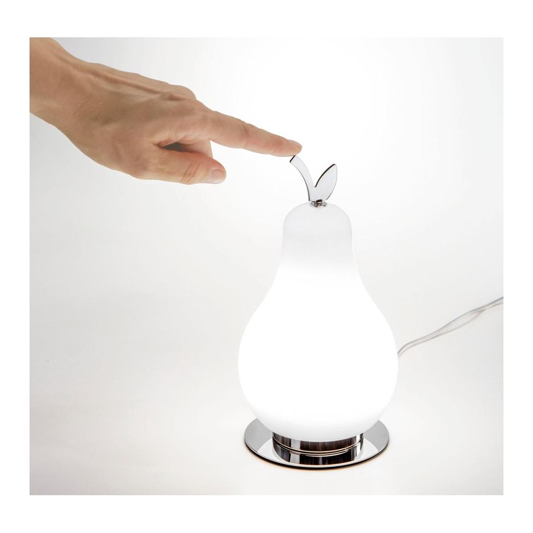 Pera bianca con base cromata, perfetta per ambienti moderni;