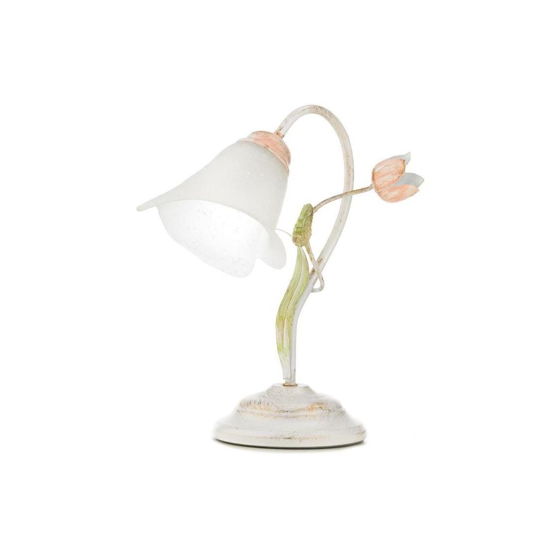Questa lampada si presenta con una stuttura realizzata in ferro battuto bianco con effetto anticato ottenuto da spennellature oro realizzate a mano in Italia; è impeziosita da foglie verdi e boccioli rosa tutti decorati a mano con il paralume realizzato in vetro bianco con decoro scavo che prendono la forma della corolla del fiore.