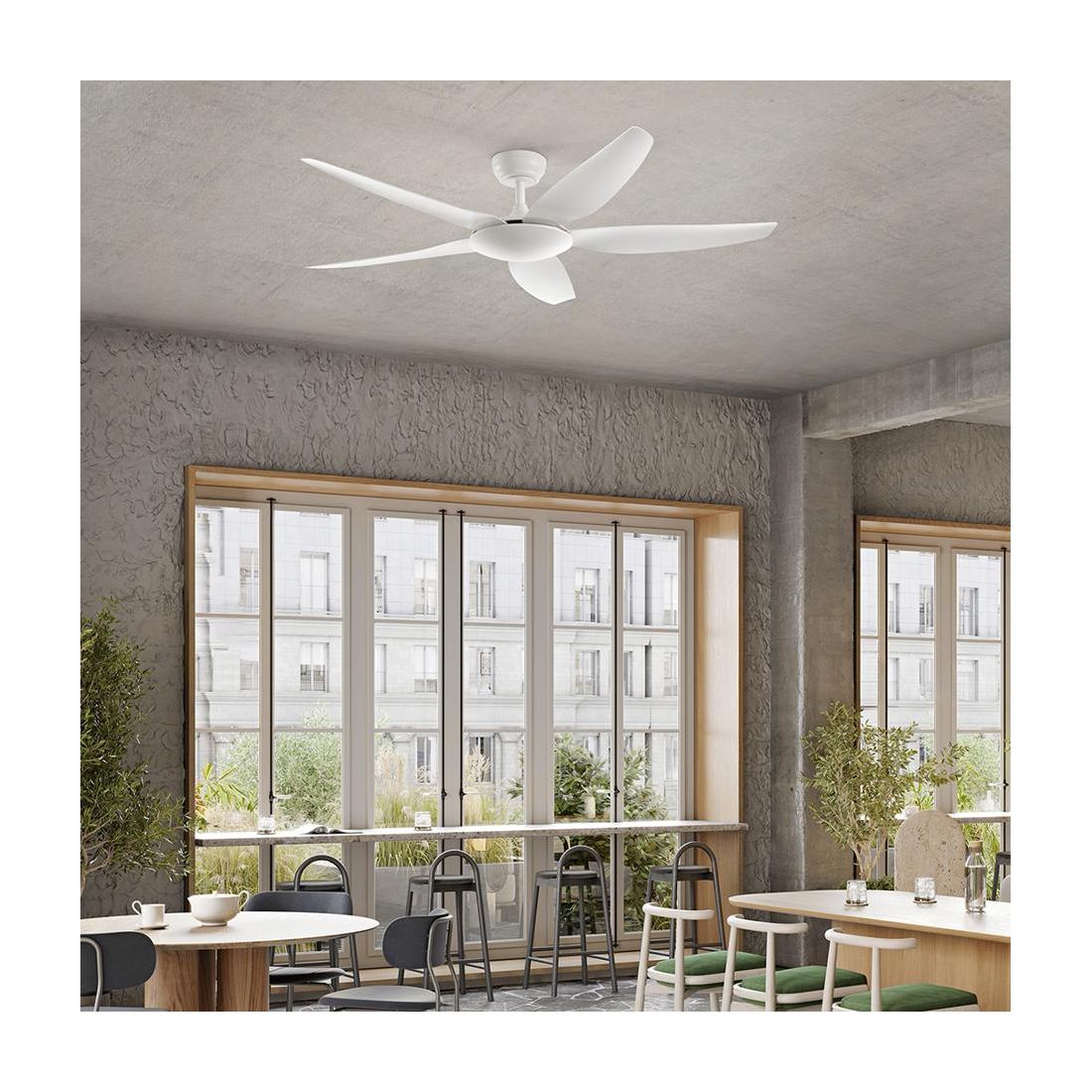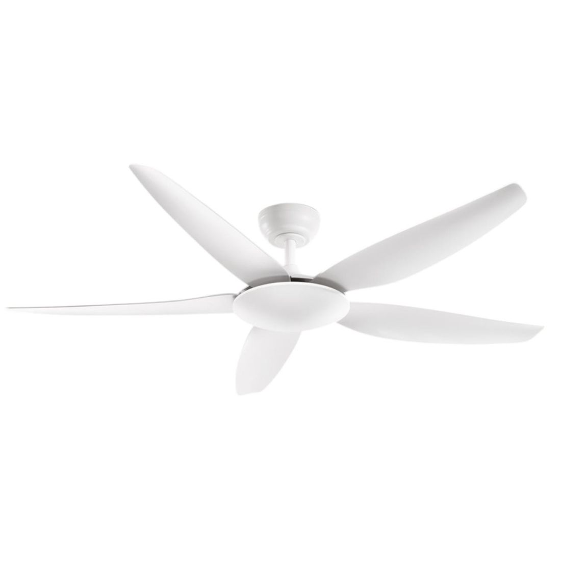 Ventilatore a 5 pale senza luce, dal design moderno, con un diametro di 142 cm, ideale per rinfrescare efficacemente ambienti con superfici superiori a 20 m² come soggiorni, camere da letto, cucine, studi o uffici. La sua struttura viene realizzata in metallo verniciato nel colore Bianco con pale in acrilico. Per garantire un’installazione personalizzata in base alle altezze dei soffitti o alle esigenze di comfort, sono fornite due aste di prolunga da 12,5 cm e 25 cm che permettono di regolare l’altezza di sospensione del ventilatore mantenendo una distribuzione ottimale del flusso d’aria.