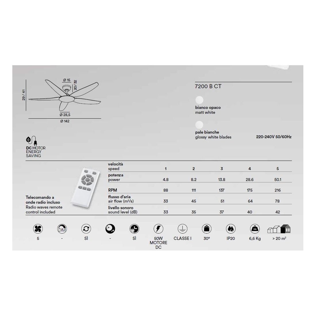 Equipaggiato con un motore DC a corrente continua di ultima generazione, questo ventilatore assicura una rotazione fluida e silenziosa perfetta anche per l’utilizzo notturno o in ambienti dedicati al relax. Attraverso il telecomando incluso è possibile scegliere tra 5 diverse velocità, regolabili in modo intuitivo, per adattare la ventilazione alle condizioni climatiche e alle preferenze personali.