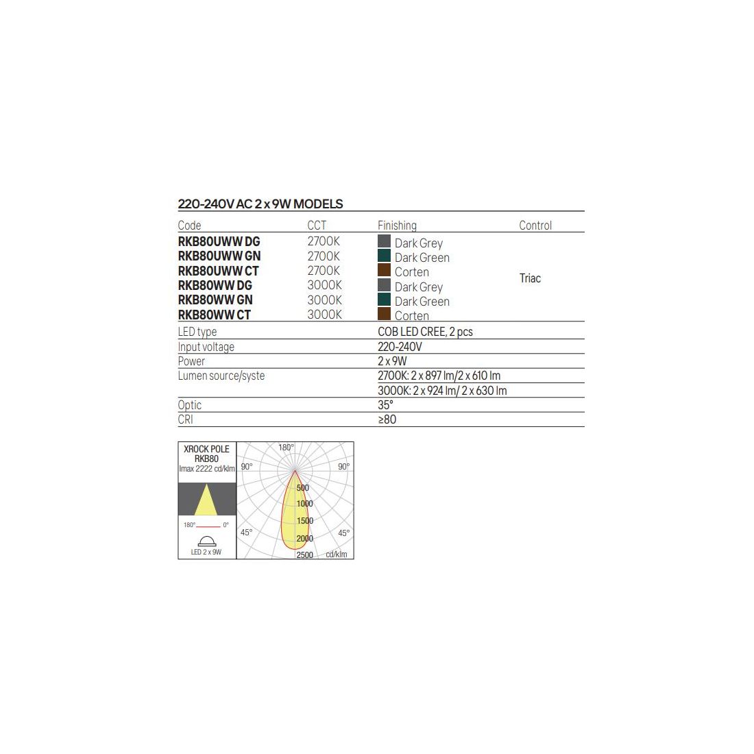 Xrock integra sorgenti luminose a Led da 18w totali e, per consentire una perfetta armonia con l'ambiente circostante, è possibile optare per due diverse temperature colore: una luce calda 2700K, ideale per creare un'atmosfera accogliente e rilassante, oppure una luce bianca calda 3000K, perfetta per un'illuminazione chiara ma confortevole, ottimale per la visibilità e la sicurezza.